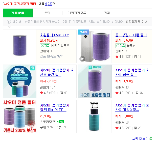 네이버에서 "샤오미 공기청정기 필터"를 검색해 봤다.